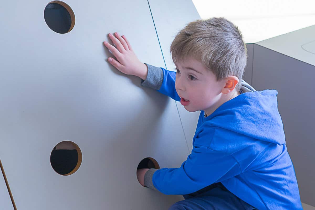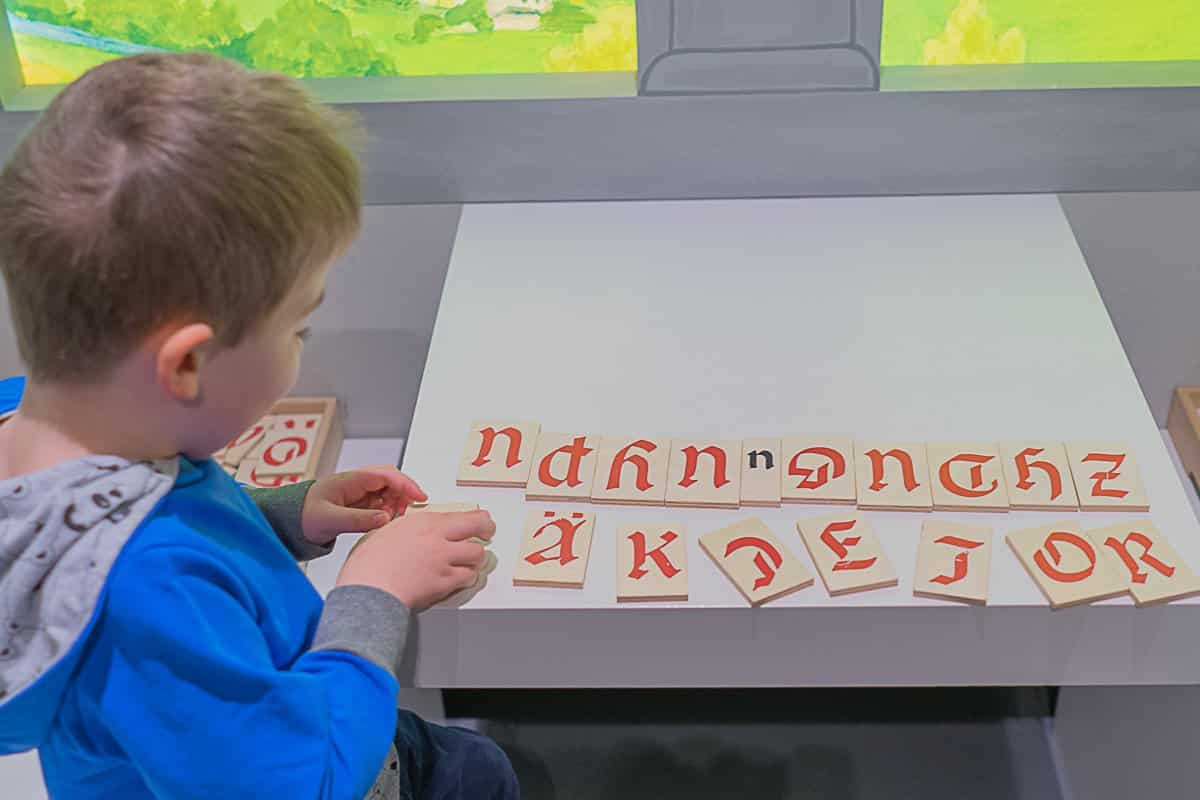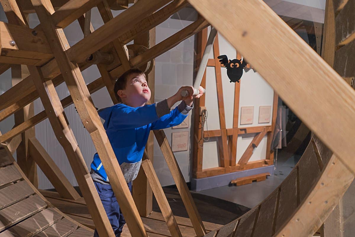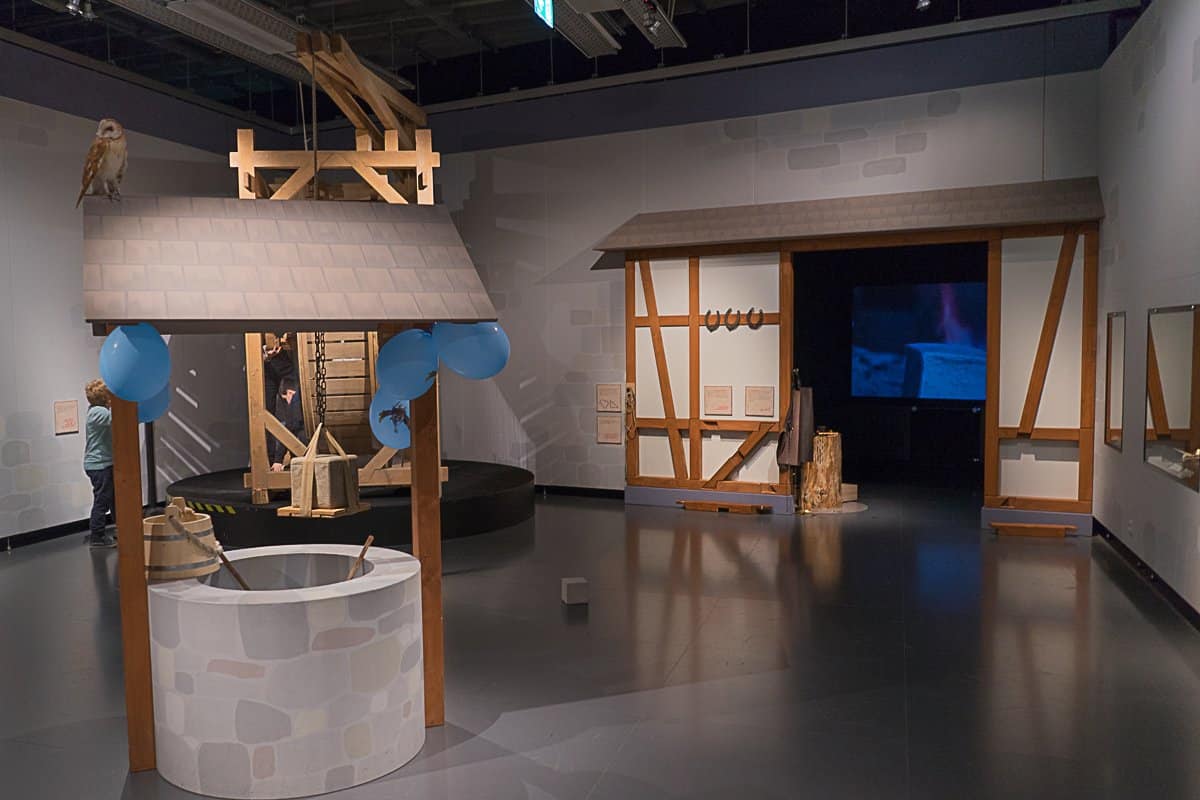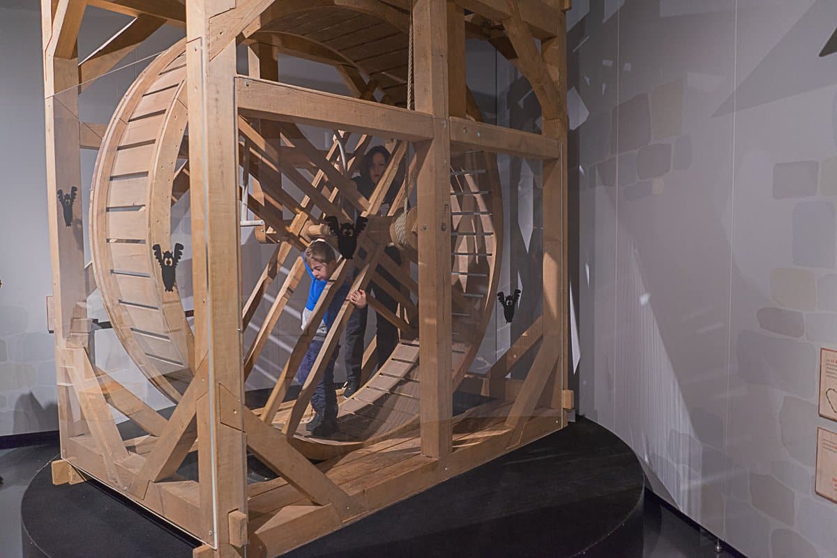 Im Burginnenhof können die Kinder anhand eines Modells sehen, wie eine Burg aufgebaut war. Alles darf natürlich angefasst und angeschaut werden. Vom Pferdestall, der Schmiede und dem Brunnen zur Wasserversorgung, bis hin zum Lastenkran – der mit Muskelkraft angetrieben wird und aussieht wie ein riesiges Hamsterrad, können die Kids alles ausprobieren.