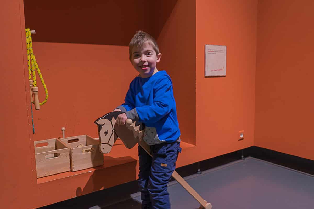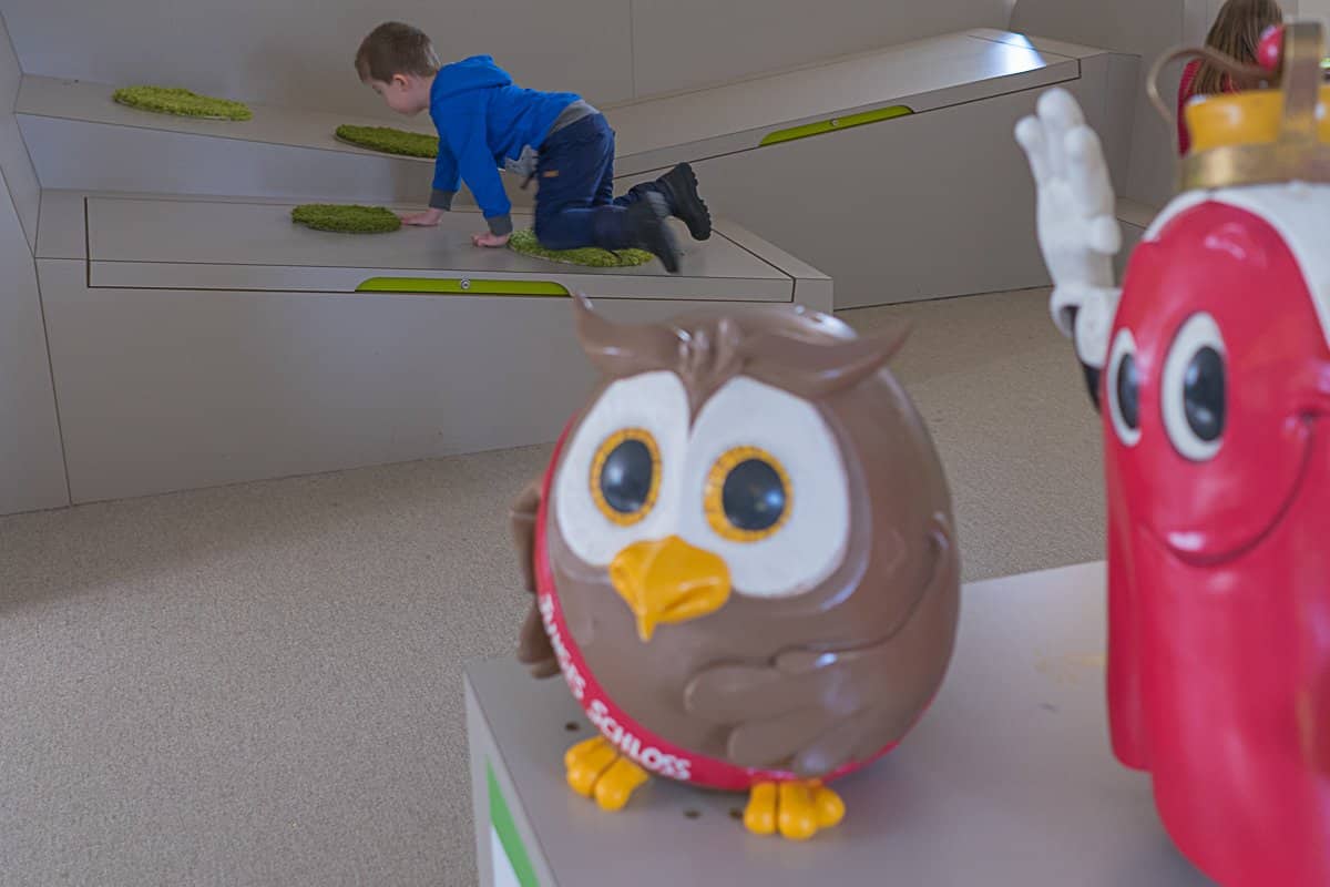Aus großen Kleidertruhen können sich die Kinder Sachen heraussuchen. Als zünftiges Burgfräulein oder Knappe können dann die Gemächer inspiziert werden. Man kann auf dem Bett ein Nickerchen machen, ein Bad im Badezuber nehmen oder dem Gesang eines Minnesängers lauschen. Ludwig musste unbedingt die Spielzeuge ausprobieren. Am lustigsten fand er das Steckenpferd, auf dem er geritten ist.