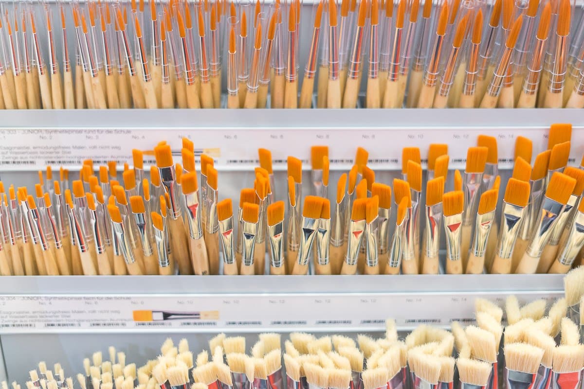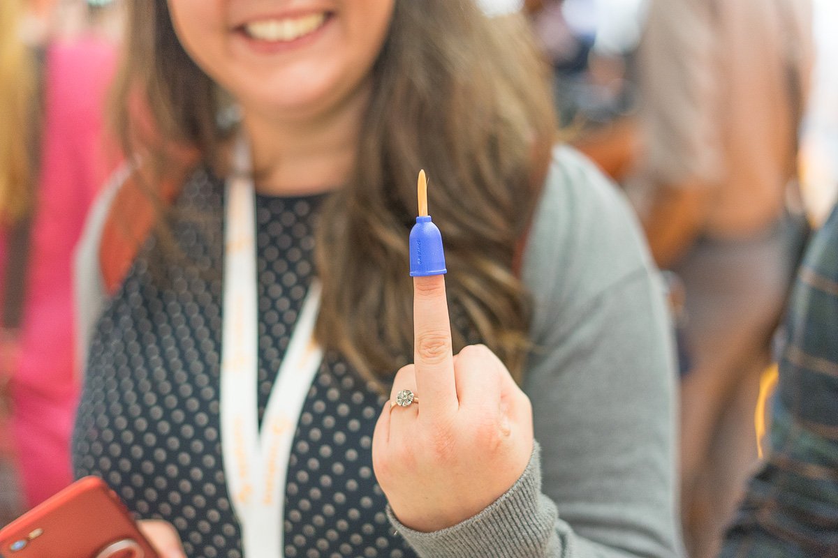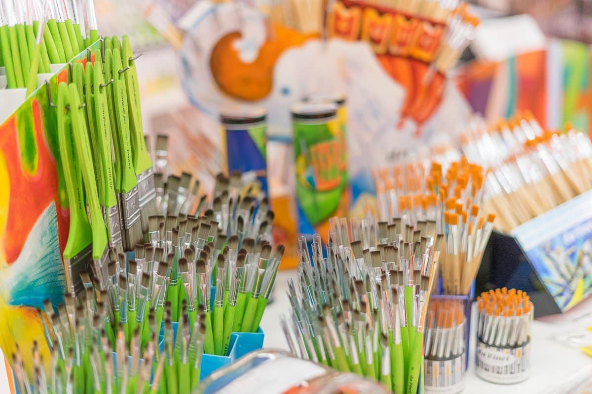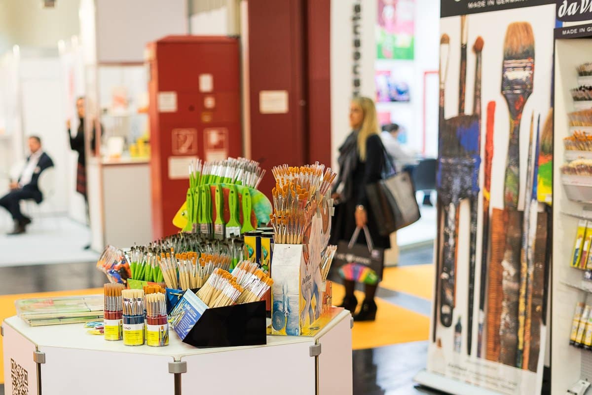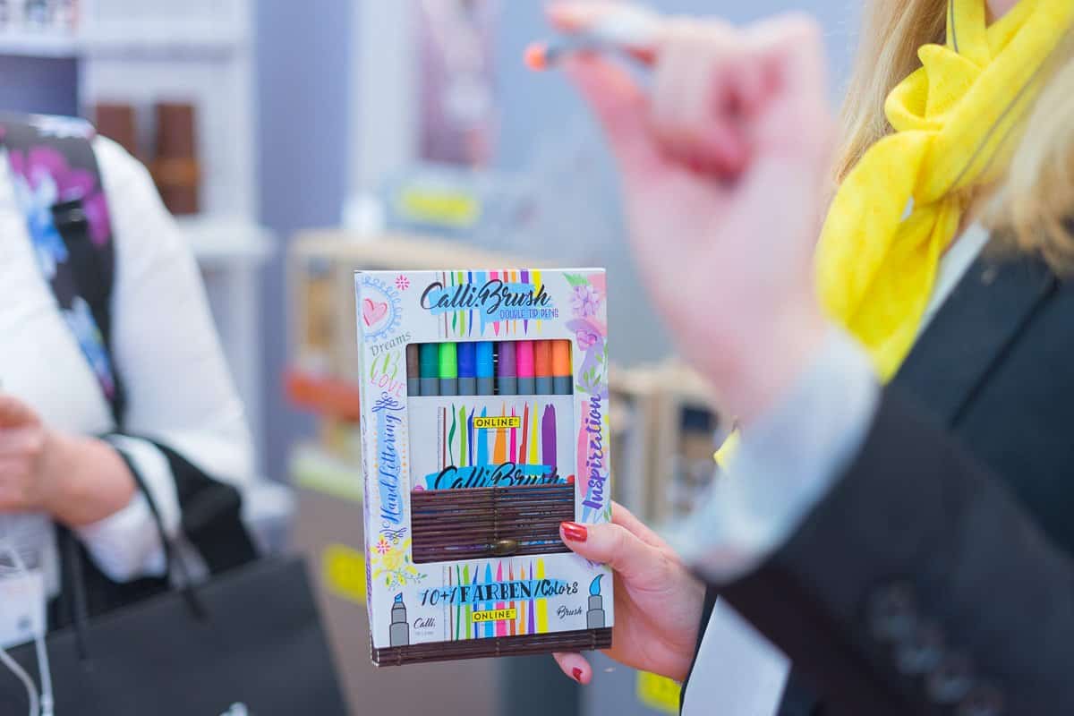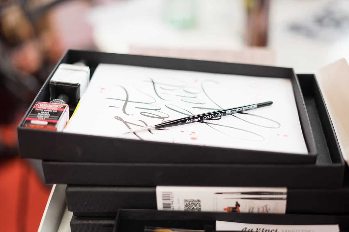 Für uns ging es weiter zur Firma da Vinci, einem Hersteller hochwertiger Pinsel. Die Firma stellt in Deutschland in Handarbeit und mit hochwertigen Materialien Künstlerpinsel, Kosmetikpinsel, Nailpinsel und Dentalpinsel her. Dort erfuhren wir auch, dass der teuerste Pinsel, den die Firma vertreibt, an die 1400€ kostet. Der Stand war besonders für die Lettering-Künstler unter uns interessant.