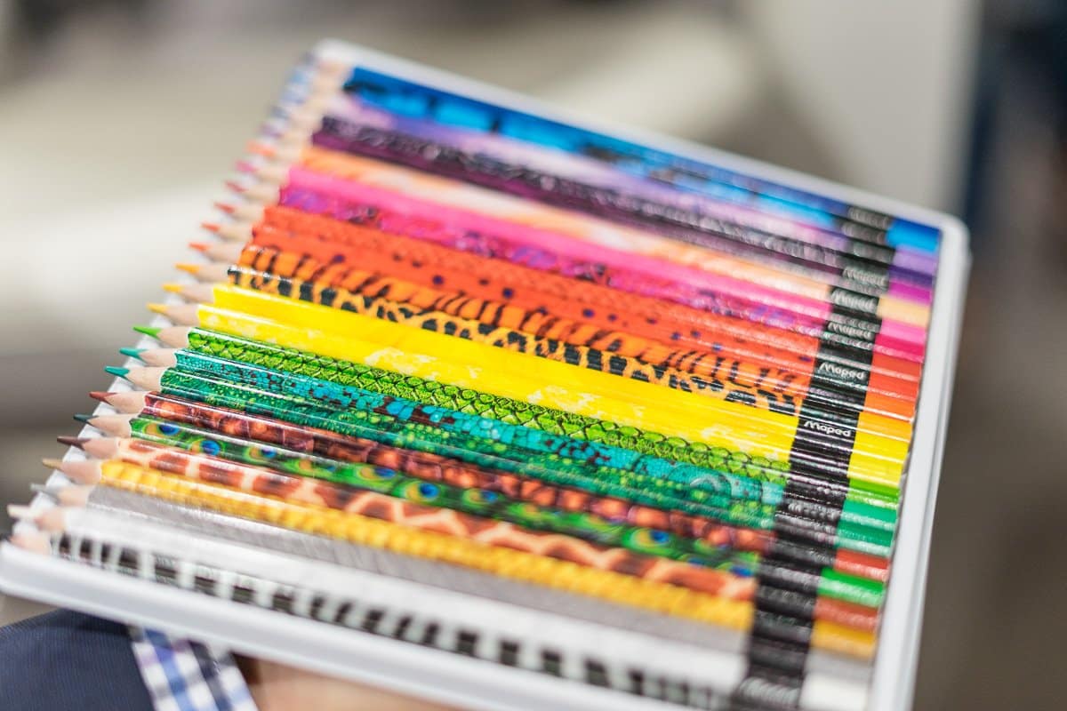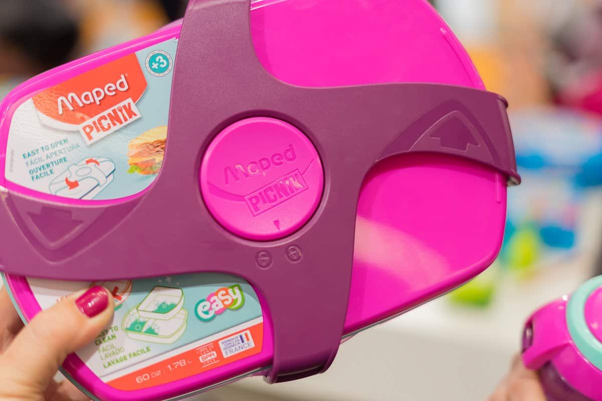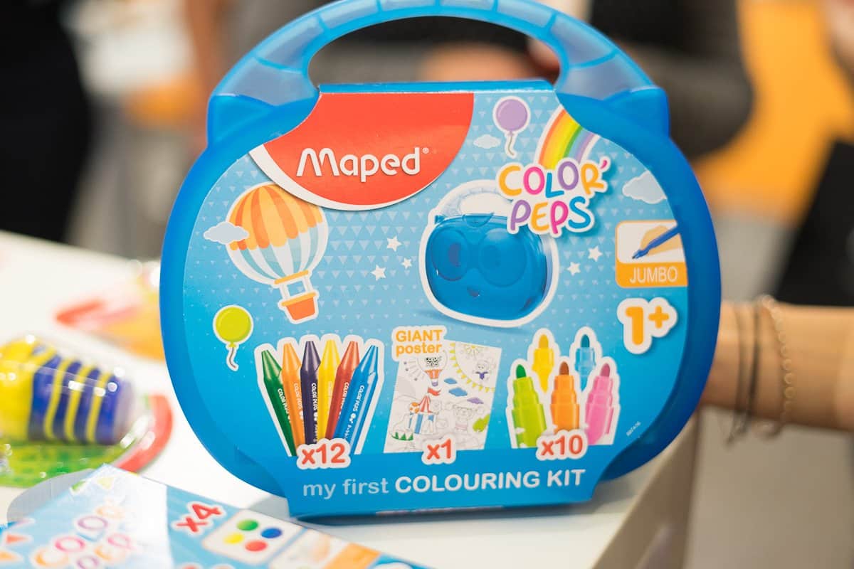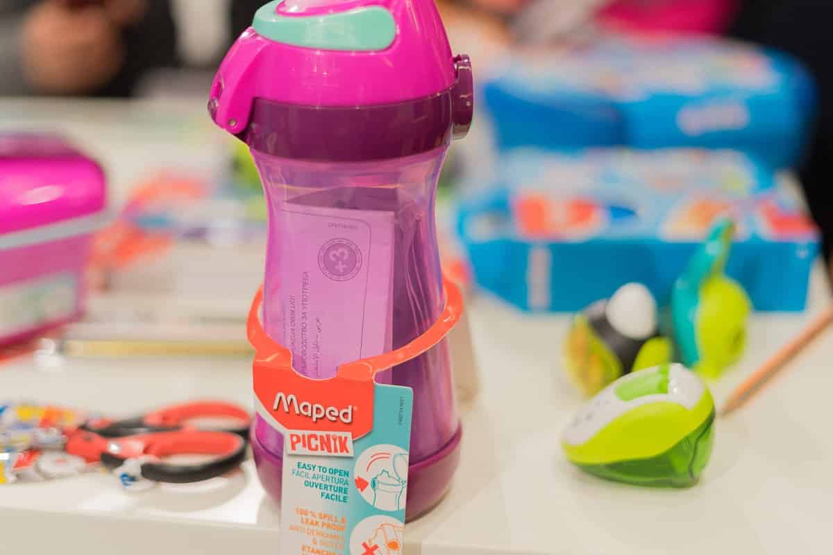 Tolle bunte Farben erwarteten uns bei der Firma Maped – dem Weltmarktführer an Schul- und Bürobedarf. Das flexible, bruchsichere Lineal oder Geo-Dreieck kennt sicher jeder noch aus seiner eigenen Schulzeit. Die Firma setzt auf bunte Stifte mit Tieroptik, lustige Spitzer und Kinder-Scheren, die wirklich nur Papier schneiden. Da braucht man sich keine Sorgen mehr machen, wenn die Kleinen herumschnibbeln. Wir durften uns selbst davon überzeugen. Weiterhin hat die Firma auch tolle Vesperdosen und Trinkflaschen in knalligen Farben im Sortiment.