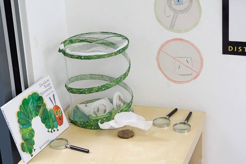 Auch Ludwigs Kindergarten hat ein Schmetterlings-Set bekommen. Der Kindergarten hat ein richtiges Naturprojekt daraus gemacht. Sie haben eine Ecke für die Schmetterlinge reserviert, verschiedene Regel wurden aufgestellt, wie nicht anfassen und nicht schütteln. Die Kinder konnten mit Lupen die Raupen und Schmetterlinge genau betrachten. Und natürlich wurde auch das Buch „Die kleine Raupe Nimmersatt“ gelesen.