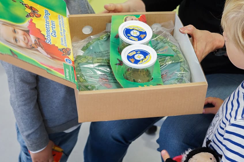 „Da sind ja gar keine Schmetterlinge drin, nur ekelige Raupen!“ war die erste Feststellung der beiden. „Ja, aber daraus sollen ganz tolle Schmetterlinge werden. Und wie das geht, das beobachten wir mal ganz genau.“
