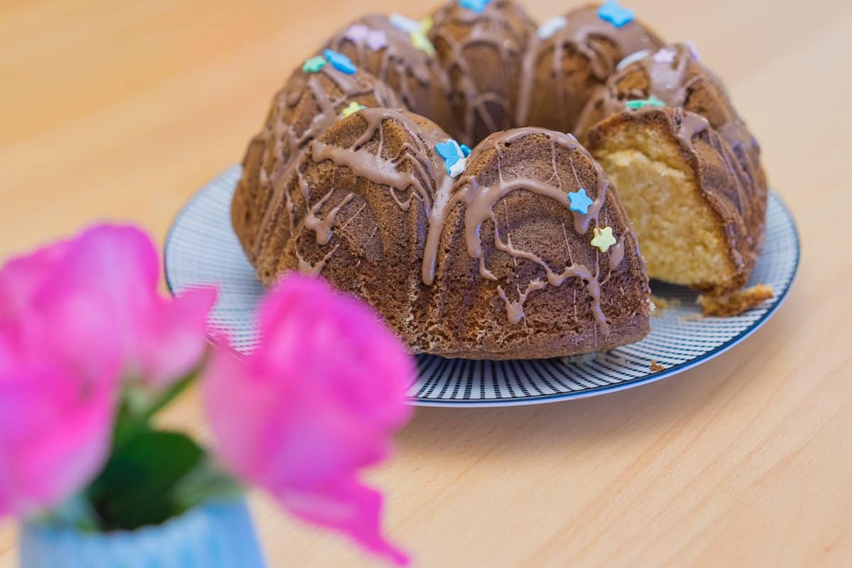 - Auskühlen lassen und dann entweder mit Schokoguss, Puderzucker oder einer Mischung aus 150 Gramm Puderzucker und 5 Esslöffel Eierlikör überziehen.