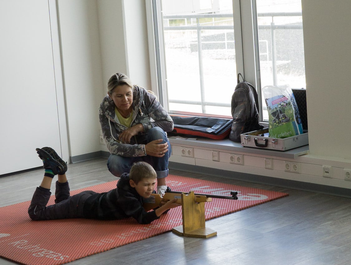 Laurenz und ich haben uns dann im Biathlonschießen ausprobiert. Gar nicht so einfach, muss ich sagen. An der Schießbude treffe ich normal immer. Mir waren die Biathlon-Waffen zu leicht. Ich hab nur einen oder zwei Treffer gelandet. Es war aber auf jeden Fall seinen Spaß wert.