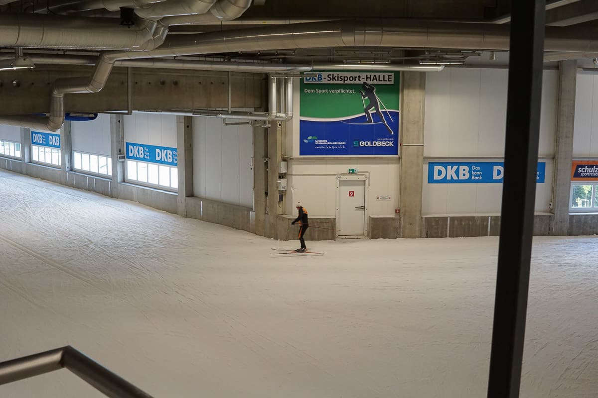 Wem der Sommer zu heiß ist, der kann sich in der DKB Skisporthalle bei -4 Grad abkühlen. In Deutschlands einziger Skilanglauf- und Biathlonhalle können sich Langlaufbegeisterte austoben. Auf einer Länge von 2 km steht den Sportlern ein abwechslungsreiches Streckenprofil mit Steigungen und Abfahren von bis zu 12% zur Verfügung. Uns war es da ein bisschen zu kalt. Aber es war interessant, das mal gesehen zu haben.