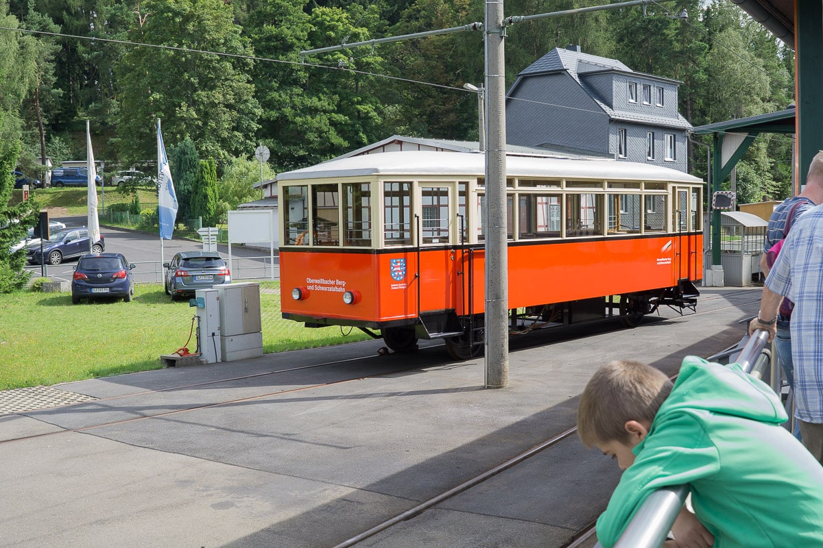 Was uns besonders gut gefallen hat, waren die Fahrten mit der Oberweißbacher Berg- und Schwarztalbahn. Wir sind von Katzhütte aus mit der Bahn nach Obstfelderschmiede gefahren. Von dort aus ging es mit der Bergbahn zur Bergstation Lichtenhain. Von Lichtenhain aus sind wir mit dem historischen Olitätenwagen (Panoramawagen mit Glasdach, Duftkasten und Kräutermemory) nach Cursdorf gestartet.
